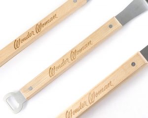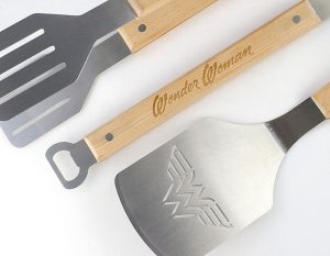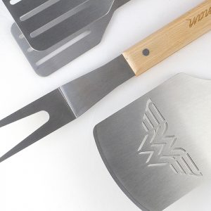 The Wonder Woman 3 pc BBQ Tool Set is the perfect gift to say thanks to the hero of the grill. It’s a three-piece set that includes a logo grilling spatula with an offset handle and a bottle opener in the handle, a grilling fork with another bottle opener in the handle, and a pair of long-handled slotted tongs. Each is stainless steel and feels good in the hand (sorry. we’ve been watching a lot of Forged in Fire.) Now the pitmaster at your next cookout will be ready for saving the world AND burger-flipping.